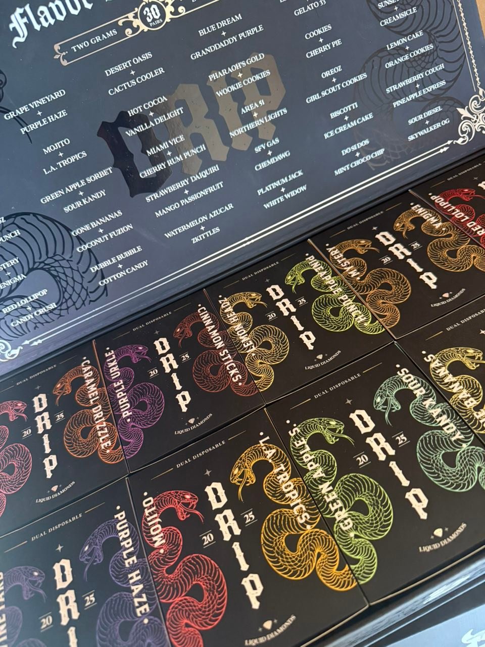 Each edition of DRIP Snake Disposable comes with strain pairings that are more than just flavor and effect, they’re experiences in contrast and complement. Depending on the release batch, you might get: