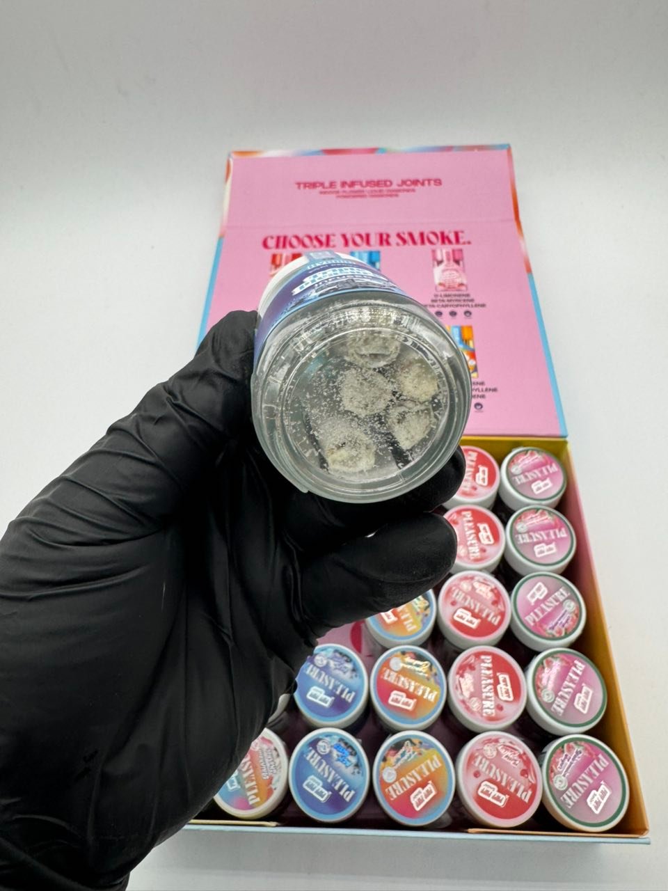 Triple Pleasure Joints come individually packaged in sleek, airtight, reusable glass tubes with child-proof caps and tamper-evident seals. Each tube is labeled with full strain information, batch number, cannabinoid profile, and QR code linking to lab results. This high-end presentation speaks to the premium ethos of the brand—these pre-rolls are not mass-produced commodities, but carefully crafted experiences.